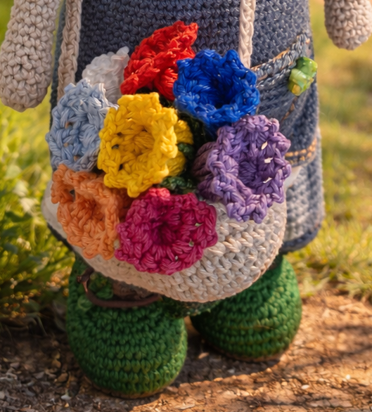Der farbenfrohe Beutel mit Blüten macht Mira zu einer besonders lebendigen und liebevollen Figur.