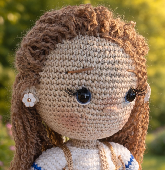 Handgefertigte Häkelpuppe für Menschen, die florale Details, sanfte Farben und echte Handarbeit lieben.